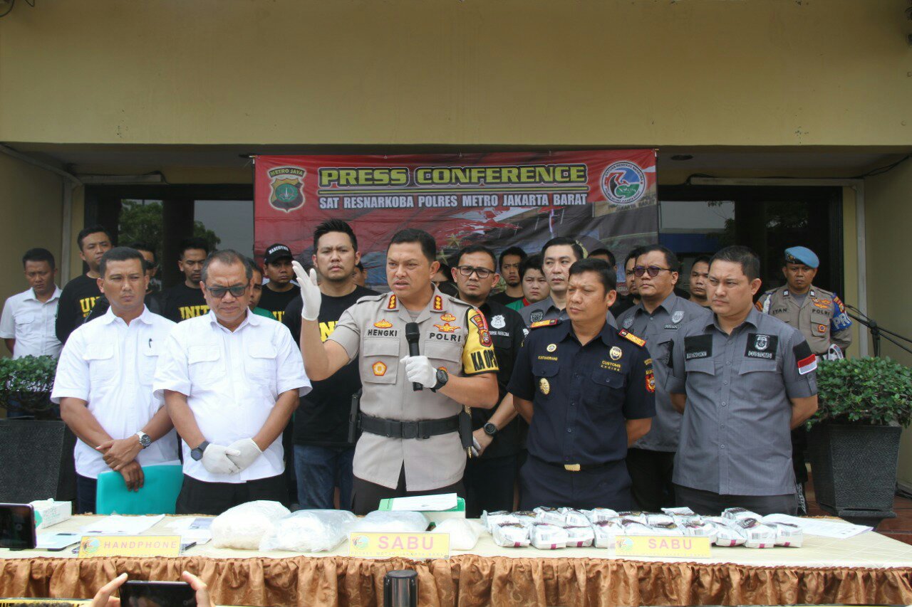 Kapolres Jakarta Barat Kombes Pol Hengki Haryadi Sik MH, mengungkapkan kronologi penangkapan tersangka sindikat penyelundupan narkotika jenis sabu jaringan Internasional.