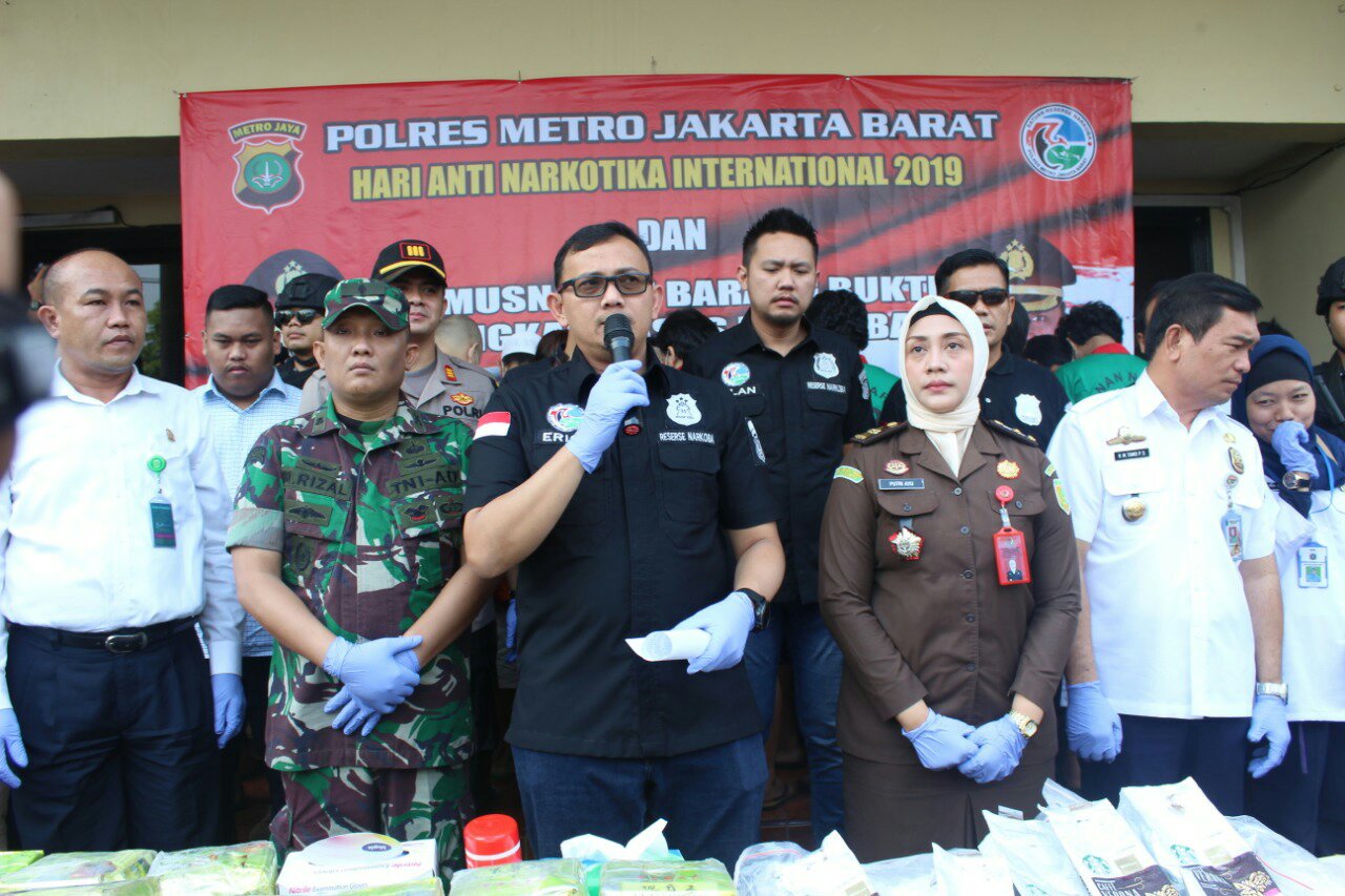 “Ya barang bukti tersebut hasil ungkap kasus narkoba dari Polres Jakarta Barat dan Polsek jajaran,” ujar Kasat Reskrim Polres Jakarta Barat AKBP Erick Frendriz saat pemusnahan barang bukti di Mapolres Jakarta Barat, Rabu (26/6/2019).