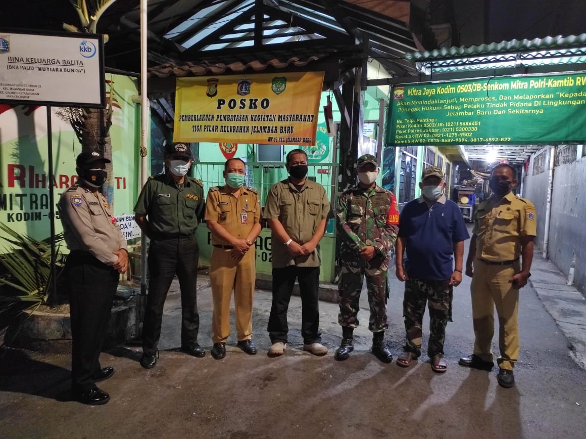 Babinsa Koramil 03/GP Dan Bhabinkamtibmas Dampingi Lurah Jelambar Baru Cek Posko PPKM