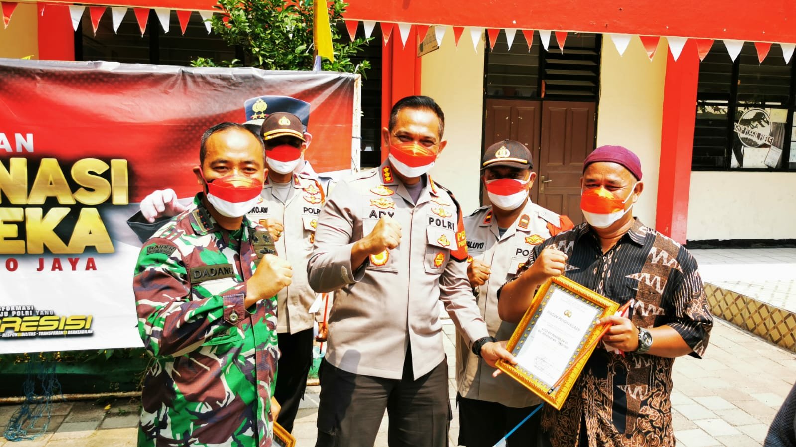 Foto: Dandim 0503/JB Kolonel Inf Dadang Ismail Marzuki dan Kapolres Jakbar Kombes Pol Ady Wibowo saat memberikan piagam penghargaan terkait Vaksin Merdeka