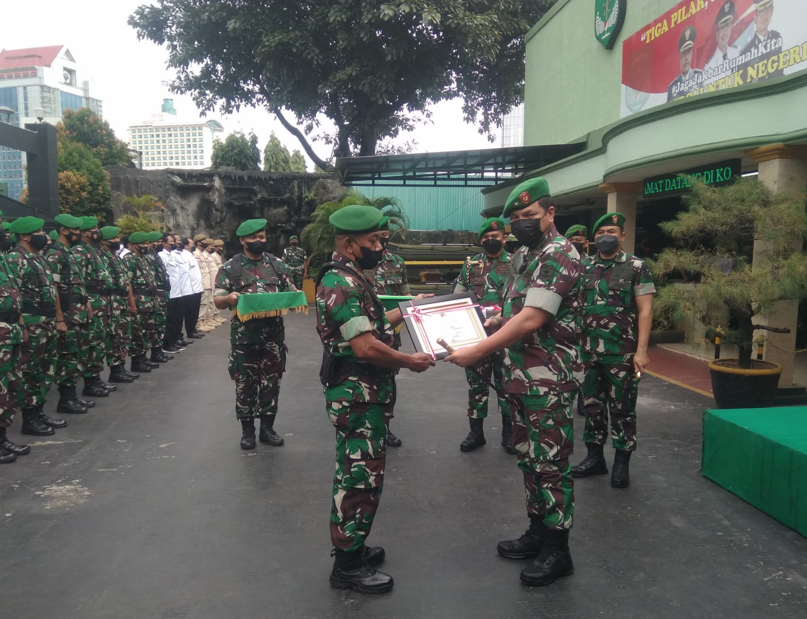 dutainfo.com-Jakarta: Aksi heroik Babinsa Koramil 04/Cengkareng, Kodim 0503/Jakarta Barat, Pelda M Jaelani yang telah berhasil membekuk pelaku penusukan, mendapatkan apresiasi dan reward dari Danrem 052/Wkr Brigjen TNI Rano Tilaar, pemberian penghargaan itu digelar dengan melaksanakan apel pasukan di Makodim 0503/JB, Jl Letjen S Parman, Jakarta Barat, Senin (7/3/2022).