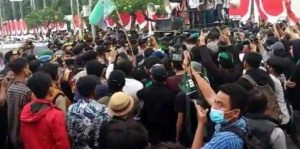 Didalam aksi tersebut, massa pendemo menuntut menolak harga kenaikan BBM, hingga pencabutan omnibus law.