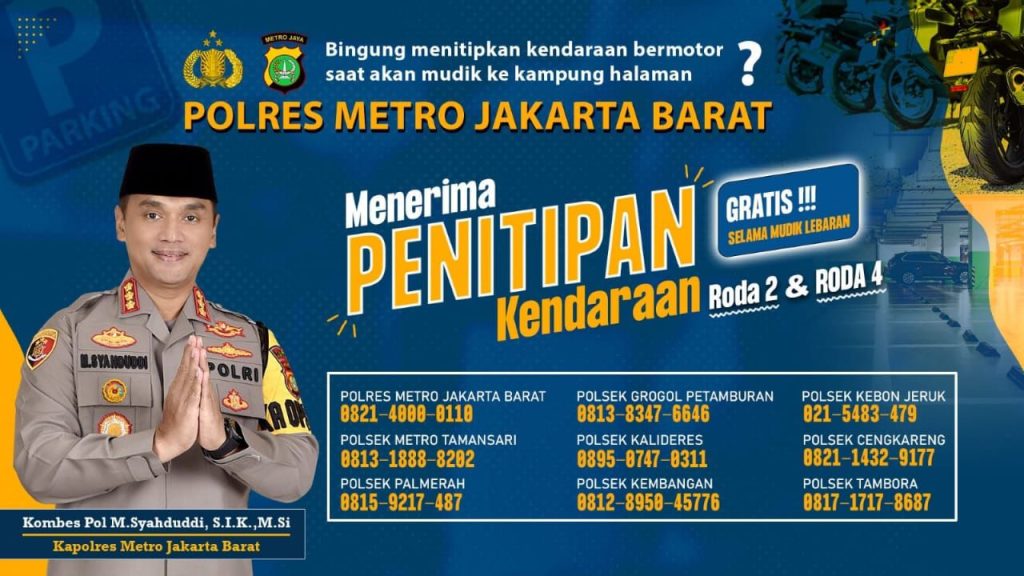 Menyikapi hal itu Polres Metro Jakarta Barat dan Polsek Jajaran membuka dan melayani penitipan baik kendaraan roda dua maupun roda empat bagi para pemudik. Layanan ini gratis dan terbuka bagi masyarakat yang ingin mudik Lebaran 2024.