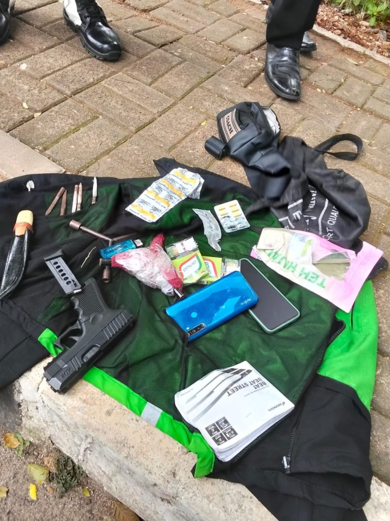 Dari hasil penggeledahan, polisi menemukan sejumlah barang bukti mencurigakan dari tas jinjing pelaku, di antaranya satu pucuk senjata api rakitan jenis FN berikut dua butir amunisi, dua kunci leter T dengan empat mata kunci, serta sebilah pisau lengkap dengan sarungnya.